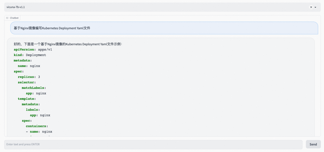 curl http://xxx:xxx:xxx:8000/v1/chat/completions \-H "Content-Type: application/json" \-d '{"model": "vicuna-7b-v1.1","messages": [{"role": "user", "content": "golang 生成一个 hello world"}]}'
