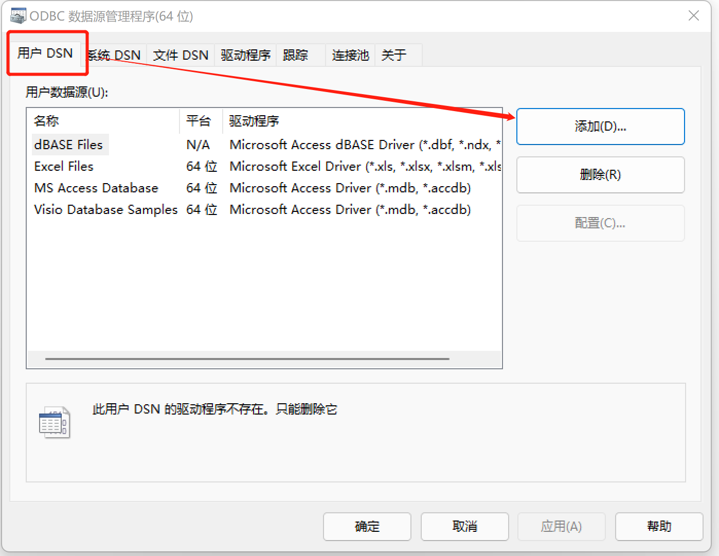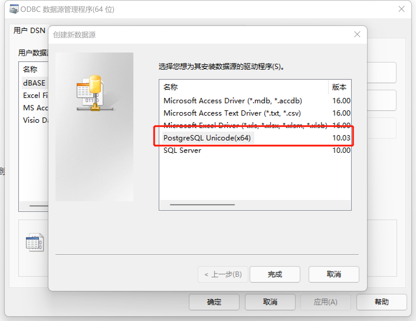 3、配置ODBC数据源,添加PostgreSQL类型的用户DSN: