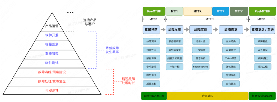 从能力驱动的角度,我们借鉴了Google的稳定性保障体系。在最底部的三层,通过故障演练/预案建设、复盘、可观测性的维度,思考怎么缩短故障处理时长;中间四层更多的是围绕研发需求、设计、上线、变更管控来降低故障的发生概率;顶层是产品运营,即通过面向内部用户的运营,指导业务对数据库进行选型和合理的使用,不断提升产品和平台易用性,并针对业务特点提供相应的解决方案。