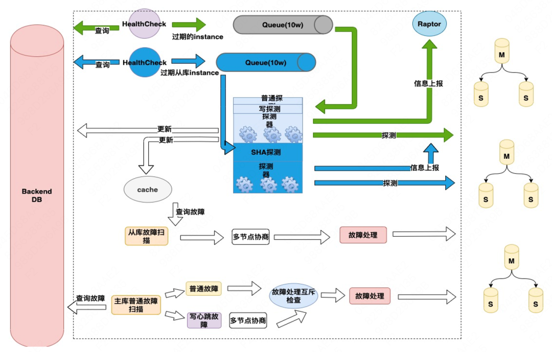 再说减少误判,我们引入了多节点协商机制,比如我们遇到某些问题会引入“多数派决策”决策让大家发挥更多意见,最终汇总得出结论。HA Core是多节点,当每个节点独立探测,探测后也会独立去做判断和分析,如只有一个Follower节点认为故障是没用的,还需要Leader的分析并向其他Follower节点发起协商共同决策,只有大多数节点认为故障才会把它确定为故障,会注册故障并进行故障处理流程。图中的Backend DB是Raft Group每个节点各自独立的存储,各自探测的拓扑以及判定决策信息等都存在本地。