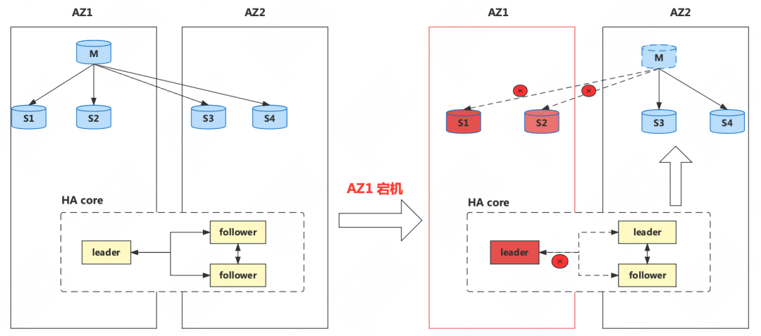 常规场景,Leader故障后会在4秒之内快速选举一个新Leader出来继续工作,但也有一些场景,如下图15所示,MySQL Master和HA 的Leader都在AZ1,如果AZ1宕机之后怎么办?其实就出现右边这个图。老Leader在处理AZ1里的MySQL节点故障的同时,由于自身Leader也在AZ1,会中断老Leader的处理状态机并选举一个Leader,但新Leader并不知道老Leader状态机如何处理,就直接导致切换的失败。