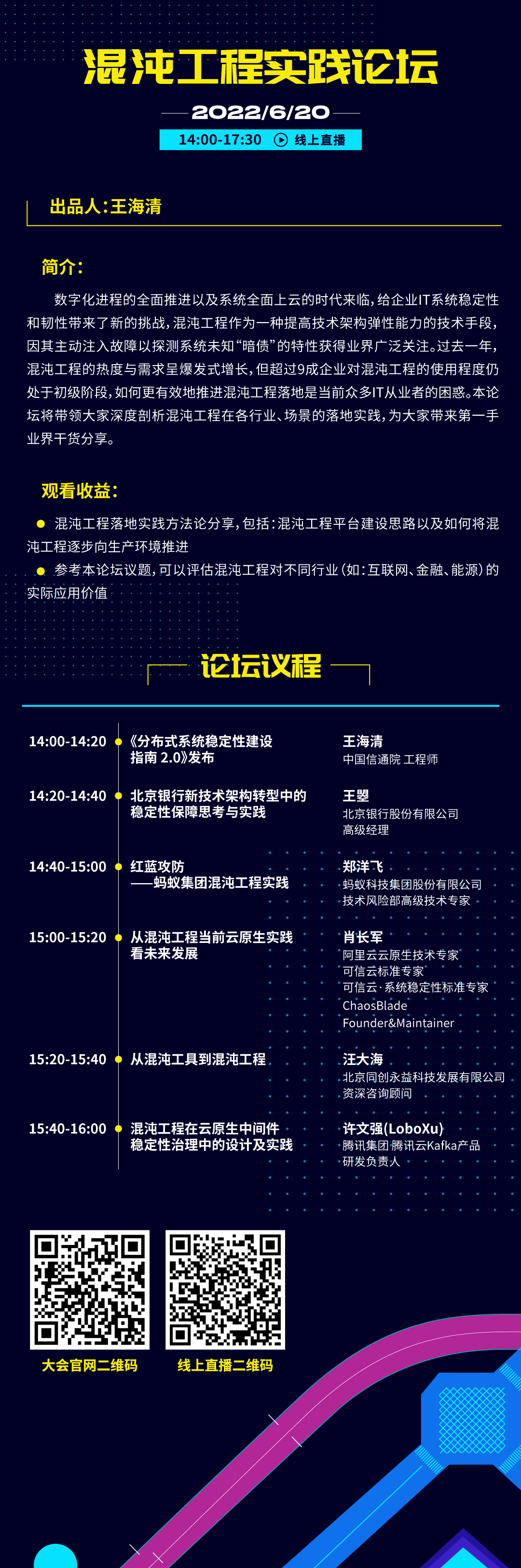 “精益软件工程大会”包括主论坛和可观测性、软件质效、混沌工程实践、金融行业4个主题分论坛。混沌工程实践分论坛将于2022年6月20日下午14:00开始。过去一年,混沌工程的热度与需求呈爆发式增长,但超过9成企业对混沌工程的使用程度仍处于初级阶段,如何更有效地推进混沌工程落地是当前众多IT从业者的困惑。本论坛将带领大家深度剖析混沌工程在各行业、场景的落地实践,为大家带来第一手业界干货分享。