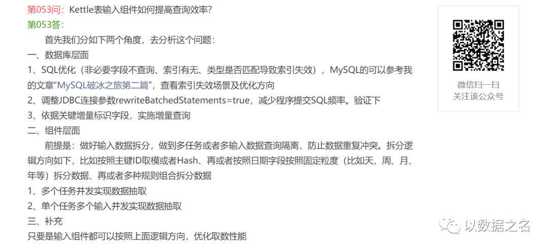 微信公众号、知乎和稀土掘金,主体均为“以数据之名” 欢迎扫码关注,回复「666」加入“以数据之名”微信交流群 本文由以数据之名分享,正所谓“道阻且长,行则将至;行而不辍,未来可期”。不知不觉中,“以数据之名”Kettle知识库专题文章“三十而立、四十不惑、五十而耳知天命、六十而耳顺、七十古稀、八零年代、九零新秀、零零后浪”,叙述了使用Kettle作为ETL开发的常见组件使用说明、业务场景实现逻辑、异常分析及组件性能优化相关内容。后续,我们跟着小编的节奏,尽量做到Kettle知识库问答系列之每日一问,做到理念和实践的生动统一。