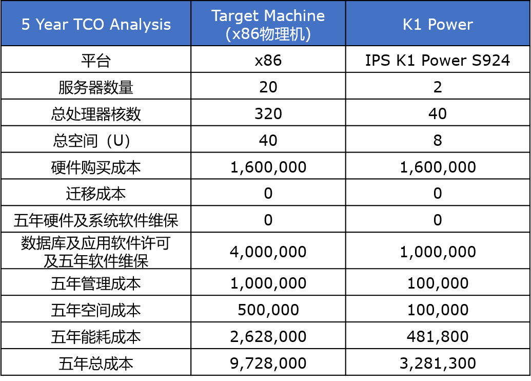 无论是升级或者替换,企业都希望在不损失处理能力的情况下,尽量的省钱(省电、省空间、省软件License)。对此,浪潮商用机器根据同等性能指标进行了测算,老旧Power服务器升级到全新K1 Power服务器,不仅能够为客户带来性能的提升,某客户实际案例表明,五年内,能够帮助客户电费节省40%,空间节省73%,软件相关的费用节省35%,整体TCO能够降低19.2%。