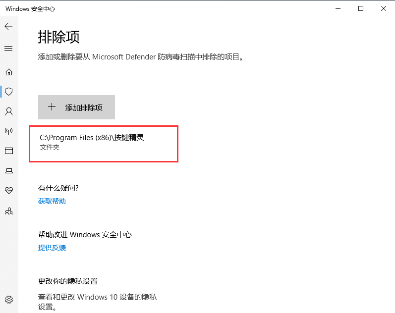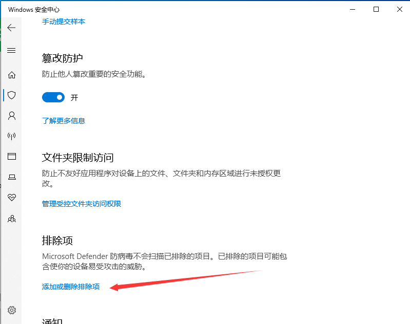 打开Windows安全中心的管理设置后,将窗口的滚动条滚动到下面,在排除项下点击【添加和删除排除项】,如下图: