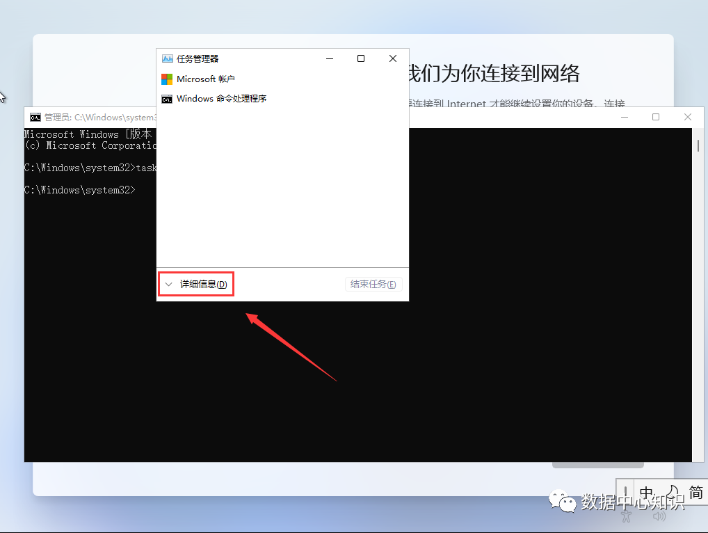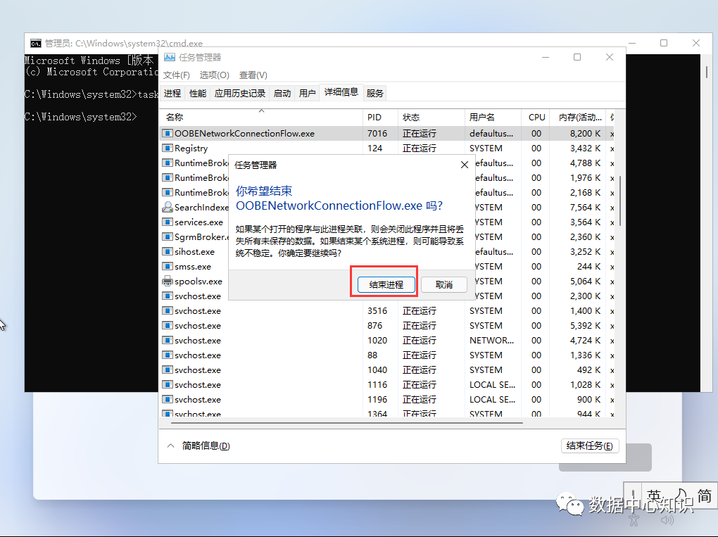 出现此界面选择结束进程,然后关闭任务管理器和CMD回到页面,联网激活就跳过。