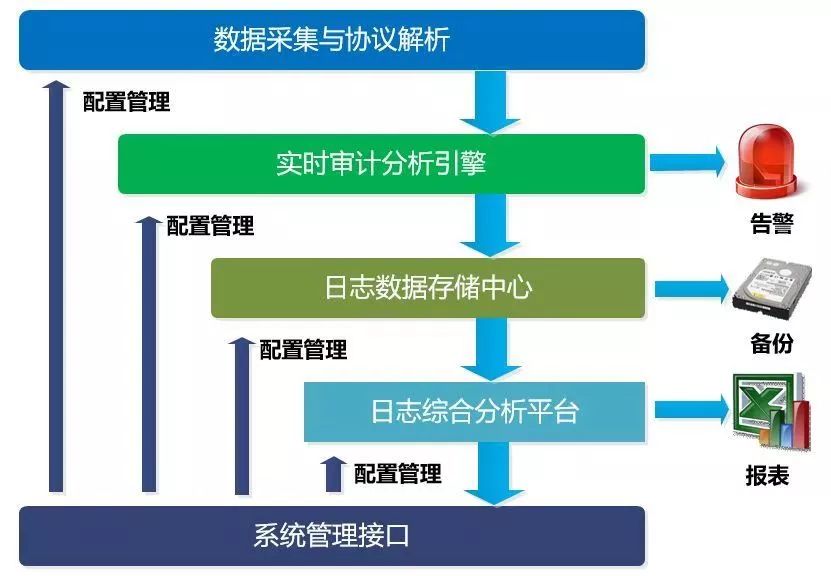 实时审计分析引擎将经过剥离的待审数据按照系统预设配置进行策略匹配,完成审计结果、风险等级、告警等信息的输出展现。之后对数据库操作日志记录、会话、事件、统计信息等审计结果以及历史告警记录进行归档处理。日志本地保存同时开方对外日志接口,实现日志备份。