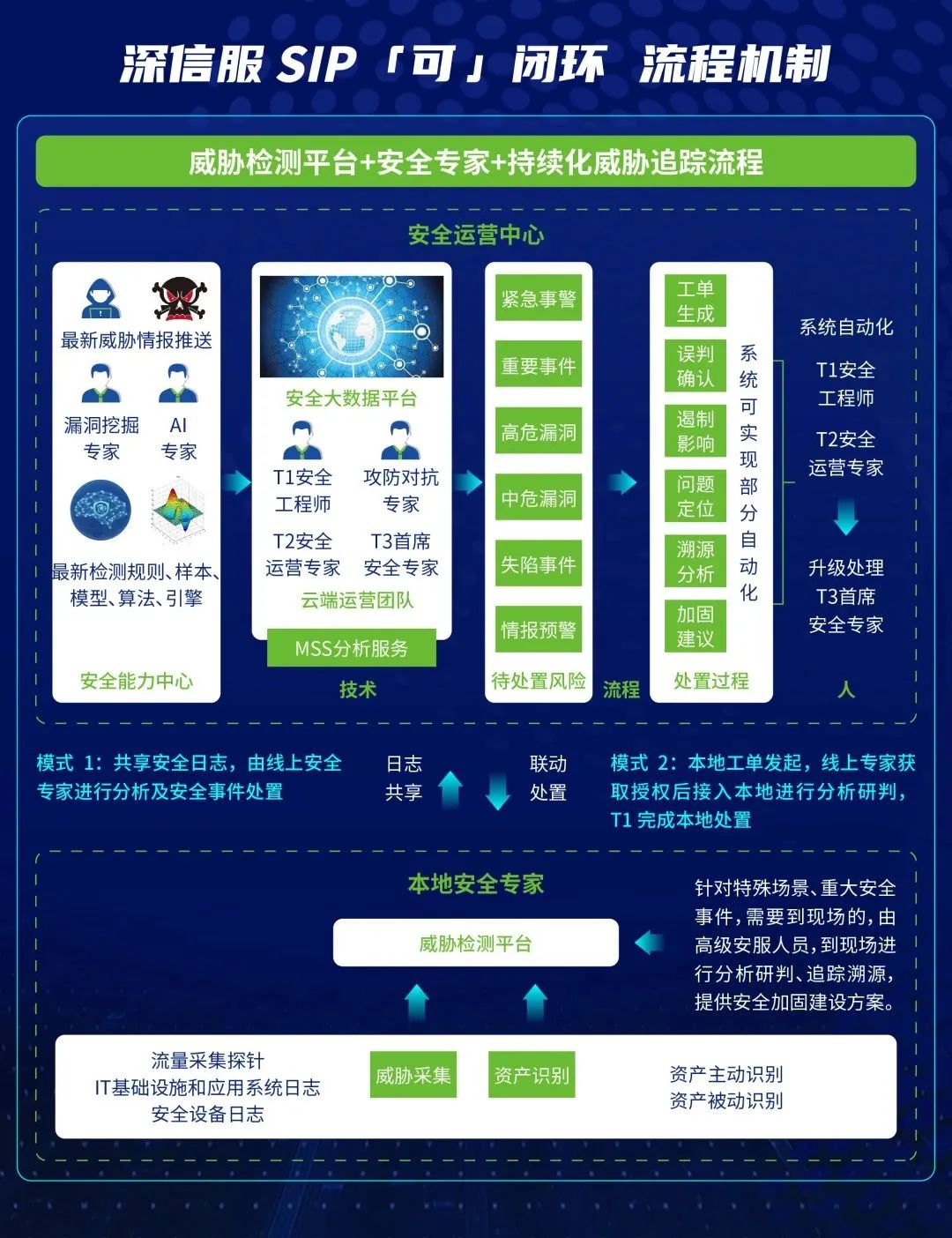 基于“人机共智”理念,深信服SIP通过数据服务接口,可扩展接入安全托管服务MSS/托管检测与响应服务MDR,7*24小时持续在线守护,通过安全专家分析研判与主动响应,释放用户安全运营的精力和专业度投入,响应时间缩短至小时级,安全事件轻松协同闭环。