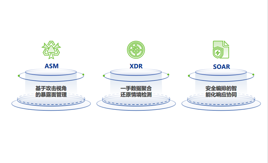 ASM基于攻击视角管理资产暴露面,能够对资产脆弱性进行优先级分析,使资产看得清,应急有先后;XDR通过网端一手数据采集,结合网端聚合分析引擎,实现攻击链深度溯源,检测能力更全面,事件响应更精准;SOAR通过安全编排的智能化响应协同,可实现安全运营的标准化、自动化、智能化。