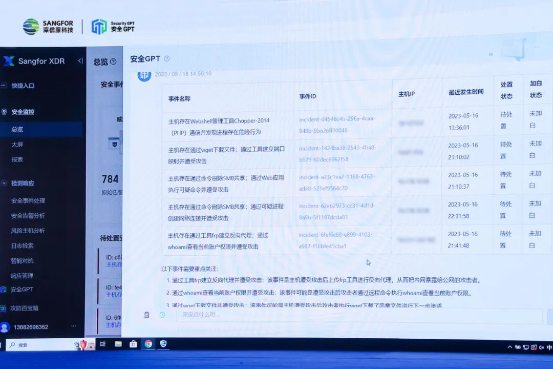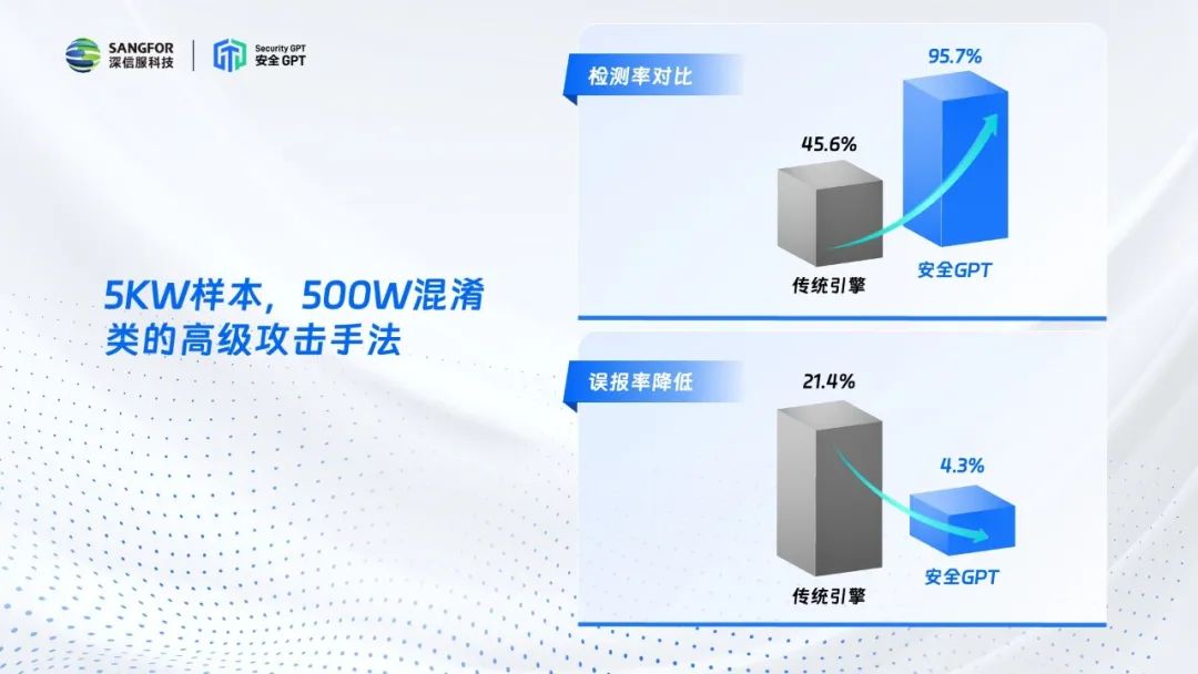 通过前期5000万样本数据测试,相较传统检测引擎,赋能安全GPT技术的深信服XDR高级威胁检测率高达95.7%,误报率(安全告警里判错的比例)仅4.3%。