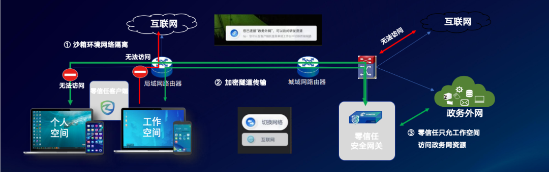 深信服基于零信任“鉴白”技术理念,结合政务终端安全接入具体需求,推出政务终端安全解决方案,通过一套平台即可满足多场景安全建设,既轻松解决政务外网终端安全性问题,也解决了过去零信任难落地问题,全方位构建政务外网终端的认证准入、合规检查、跨网访问、违规外联、NAT终端溯源、终端数据保护等安全能力,全面打造“安全合规、架构稳定、产品易用”的政务终端安全环境。