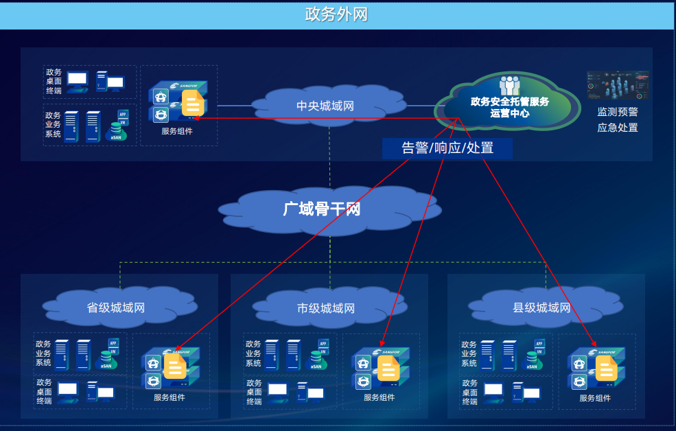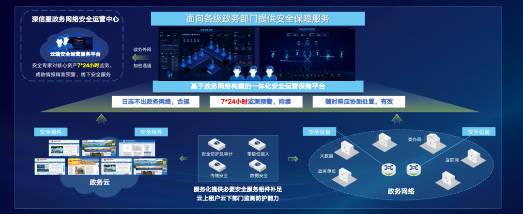 基于电子政务外网的7*24H安全托管服务能力,保障政务数据不出电子政务外网,深信服利用安全运营中心帮助客户持续进行安全监测,时刻洞悉网络的事件根因,在威胁未发生之前实现最大化精准预警,并进行安全策略调整