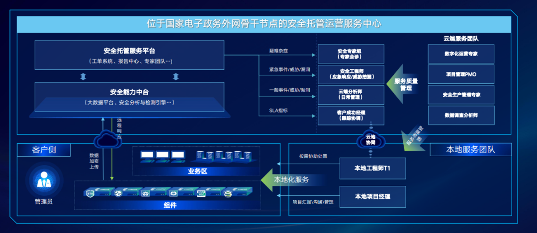 安全托管服务MSS以保障风险管控效果为目标,以“人机共智”模式为手段,基于建设于国家政务外网骨干网的政务MSS节点,以 7*24h持续在线守护为主线,以“资产、脆弱性、威胁、事件”四个核心安全风险要素为抓手,提升组织安全风险管控能力和安全工作效果,为用户提供持续、有效、省心、便捷的安全托管服务。