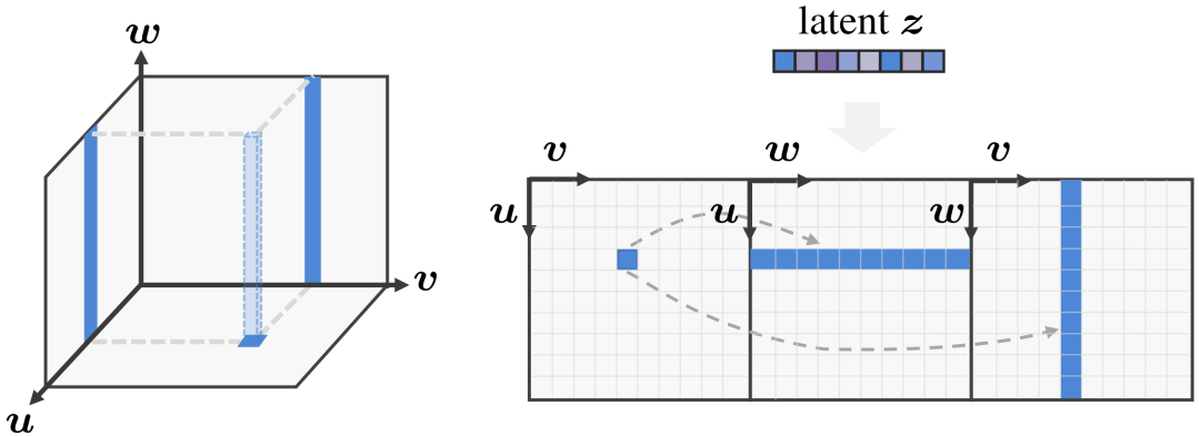 图3:3D 感知卷积高效处理 3D 特征。(左图) 用三平面(triplane)表达 3D 空间,此时底部特征平面的特征点对应于另外两个特征平面的两条线。(右图)引入 3D 感知卷积处理展开的 2D 特征平面,同时考虑到三个平面的三维固有对应关系。
