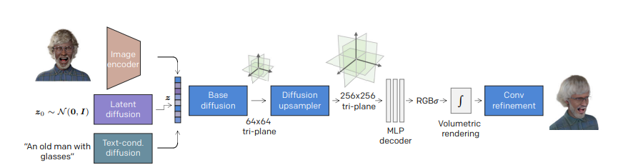 隐空间协奏三平面 3D 表达生成。研究员们通过隐向量来协调特征生成,使其在整个三维空间中具有全局一致性,从而获得更高质量的化身并实现语义编辑,同时,还通过使用训练数据集中的图像训练额外的图像编码器,该编码器可提取语义隐向量作为扩散模型的条件输入。这样,整体的生成网络可视为自动编码器,用扩散模型作为解码隐空间向量。对于语义可编辑性,研究员们采用了一个冻结的 CLIP 图像编码器,与文本提示共享隐空间。