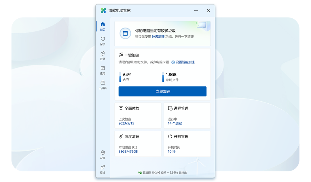 本次升级,我们秉承“智能高效”“一触即达”的理念,对一键加速、系统保护、存储空间管理、应用管理等功能进行了全面提升,并对应用界面做出了更贴合使用习惯的调整。我们旨在为你提供更安全、轻便、快速的一站式电脑管家服务,为你的Windows 系统保驾护航。
