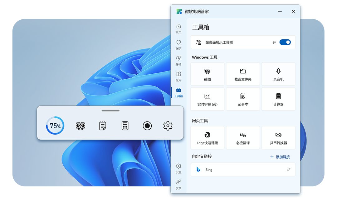 微软电脑管家V3.0新增了桌面工具栏,方便你快速访问截图、录音机、记事本、计算器等Windows原生工具,以及必应翻译、货币换算器等网页工具。