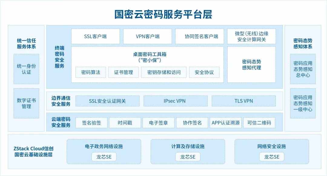 基础设施层,采用自主可靠的龙芯5000系列服务器(内置SE安全模块)作为计算、存储、网络、密码服务的基础设施,为ZStack信创云平台提供硬件密码引擎、密钥管理、安全存储与随机数发生等功能。