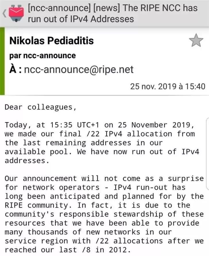 尽管一直在帮助客户进行IPv6改造升级,但近期的一个新闻还是让我觉得有必要再说说这件事,因为IPv4的资源已经耗尽了。