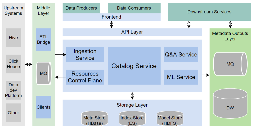 Metadata Outputs Layer:提供除了API之外的另外一种下游消费方式 MQ:用于暂存各类元数据变更消息,格式由Catalog系统官方定义 Data warehouse:以数仓表的形式呈现的全量元数据