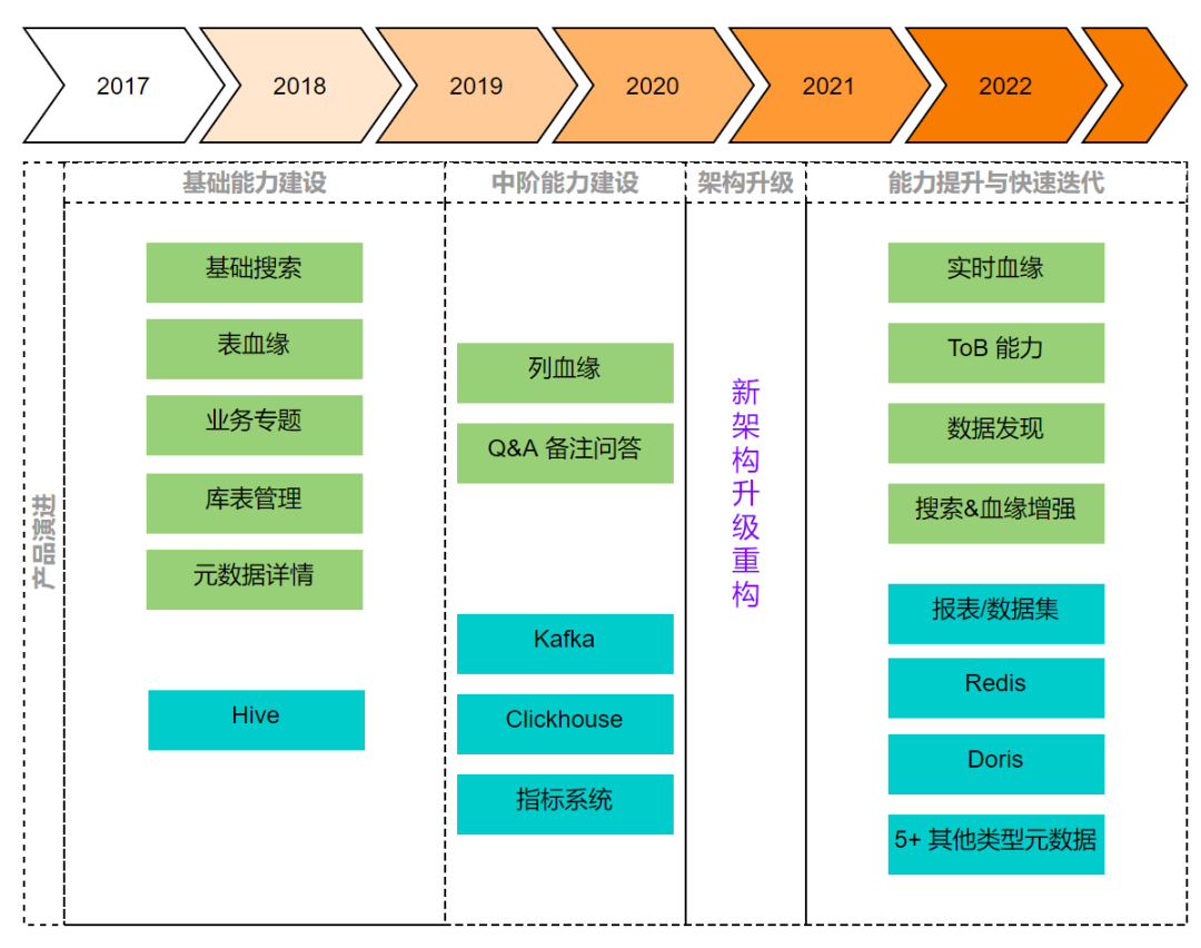 能力提升与快速迭代(2021年至今):数据源扩展为包含离线、近实时、业务等端到端系统,搜索和血缘能力有明显增强,探索机器学习能力,产品形态更成熟稳定。另外我们还具备了ToB售卖的能力。