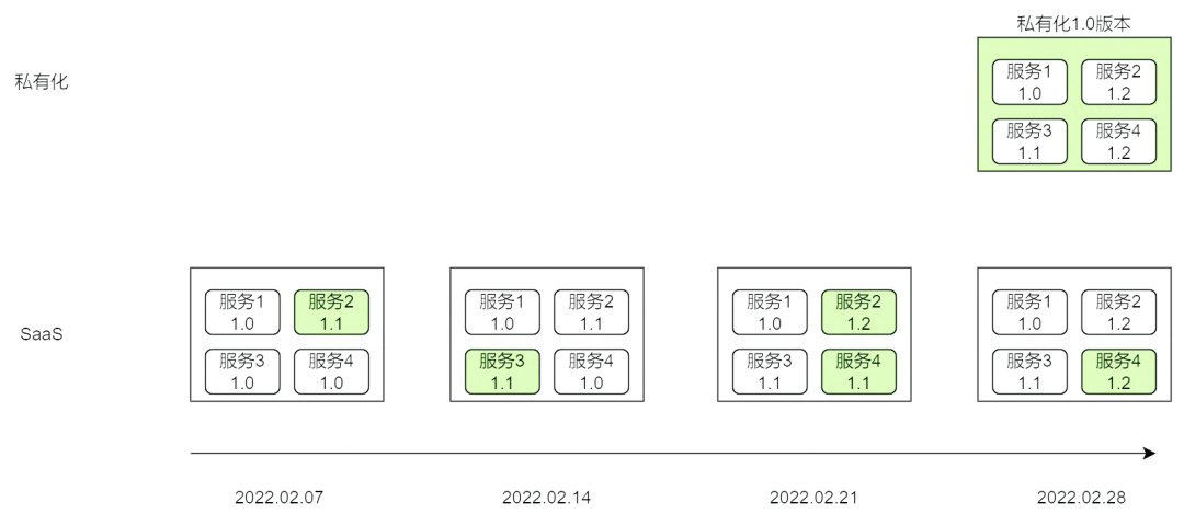 由于私有化和 SaaS 服务在架构、实现、基础底座上均存在不同,上述的发布节奏会带来一个明显的问题: