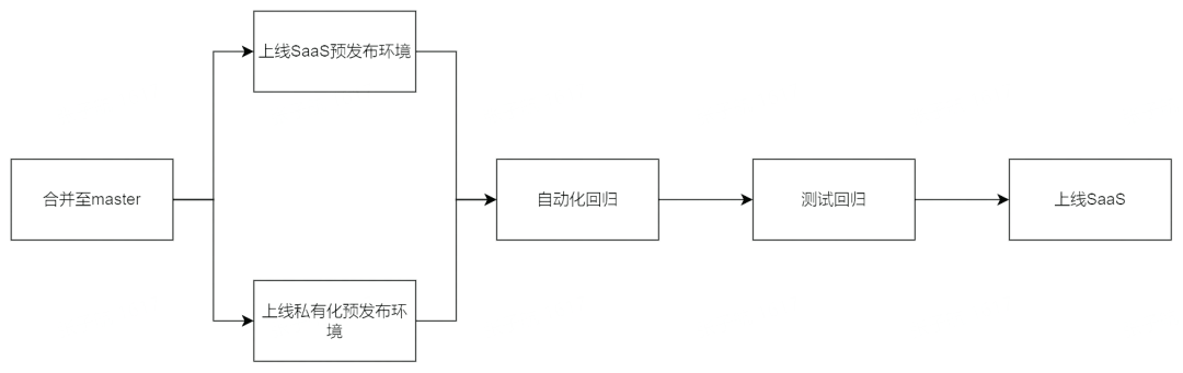 内部搭建一套私有化预发布环境,建设了一套流水线,对 master 分支的 mr 会触发流水线同时在 SaaS 预发布环境和私有化预发布环境更新最新 master 分支代码,并执行自动化回归和人工回归测试。这样做的好处在于: