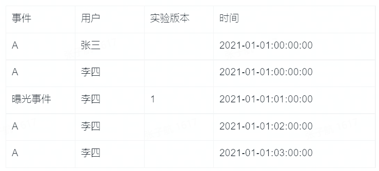 集成 SDK 调用 A/B 分流方法的同时会上报一条实验曝光事件记录用户的进组信息,后续指标计算认为发生在进组之后的事件受到了实验版本的影响。举个例子: