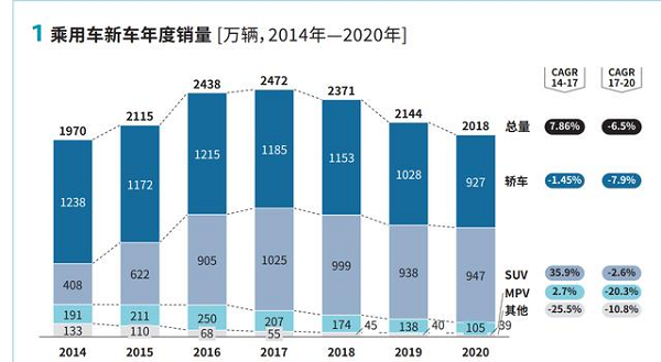 今年3月,中国汽车工业协会信息发布会在北京召开,中国汽车工业协会副秘书长陈士华在会上援引国家统计局数据表示,“1-2月,汽车产销分别完成423.5万辆和426.8万辆,同比分别增长8.8%和7.5%。”并总结,汽车行业经济运行在过去的2月份呈现出“汽车产销同比稳中有增”和“新能源汽车同比继续保持高速增长”的特点。回看过去几年,我国在经历了2017年乘用车销量攀至顶峰后,已经连续三年销量呈下降趋势,年均复合增长率约为-6.5%,汽车产业进入市场与产业结构的深度调整期。