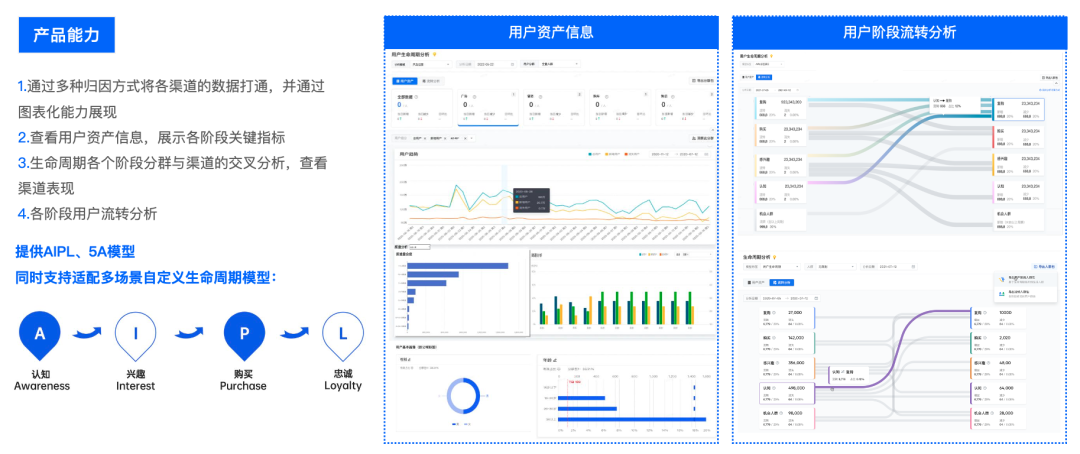 采集并整合全域数据:采集并整合包括用户行为、经营数据、平台数据等多方数据来源; 覆盖客户业务场景分析需求:在产品、运营、用增等业务场景提供所需要的业务数据; 智能决策并驱动业务:引导实际的业务动作