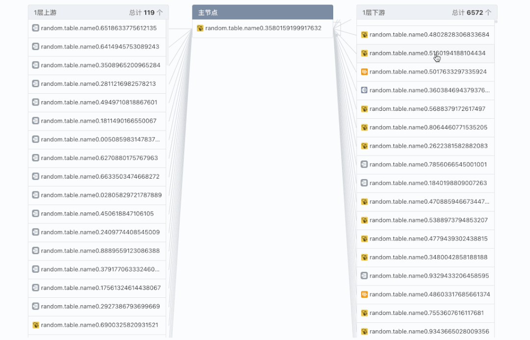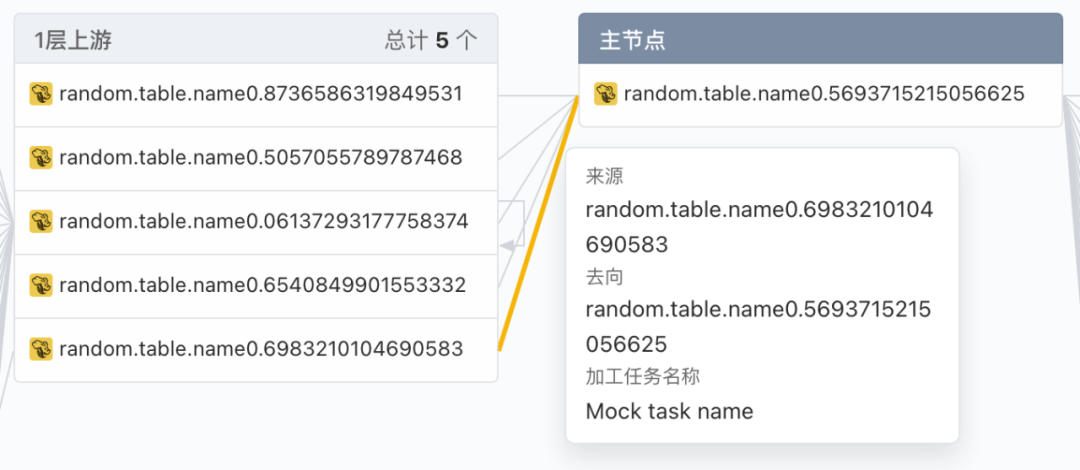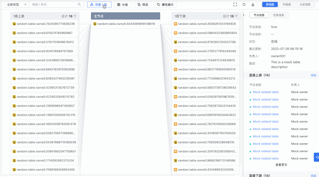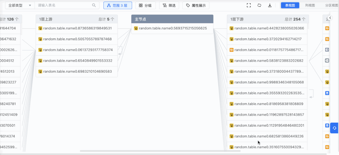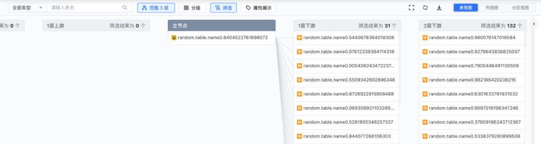 表血缘关系查看:能从图中清楚的浏览用户关注的表的上下游血缘关系,最好还能便捷的查看一些场景相关的表属性。