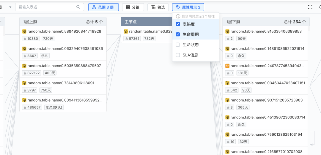 不同职能的用户在不同场景下使用血缘图谱时关注的节点属性并不相同,如果血缘图谱可以直接在图上显示用户当前想关注的表属性就能帮助用户更高效的解决问题。于是我们在血缘图谱上设计了属性展示功能,用户可以勾选自己感兴趣的属性直接显示到图中。比如下图中展示了每个节点表热度和生命周期两个属性。