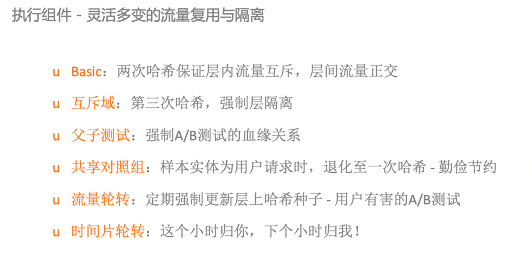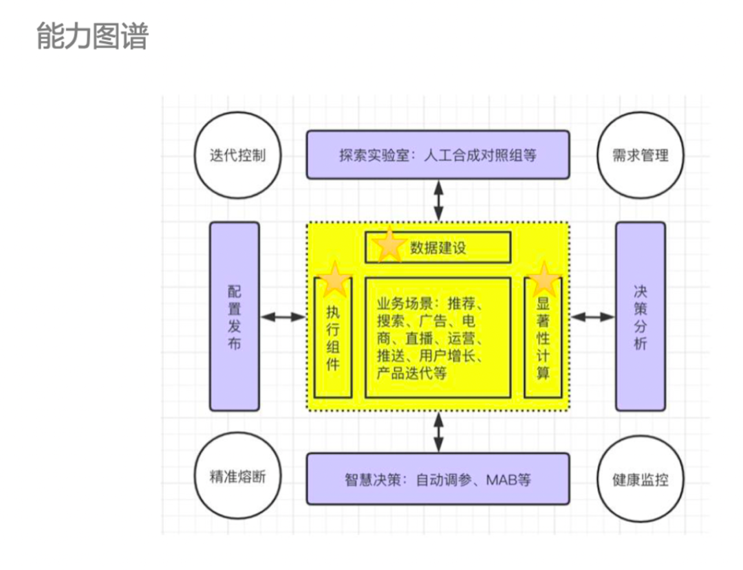 围绕着这个核心问题,我们需要三个基础环节的帮助,也就是黄色框中的三个长方形。- 第一个是执行组件,一个实验进行时,首先需要将准确的配置定向下发给准确的用户,也就是做好流量的配置发布。
