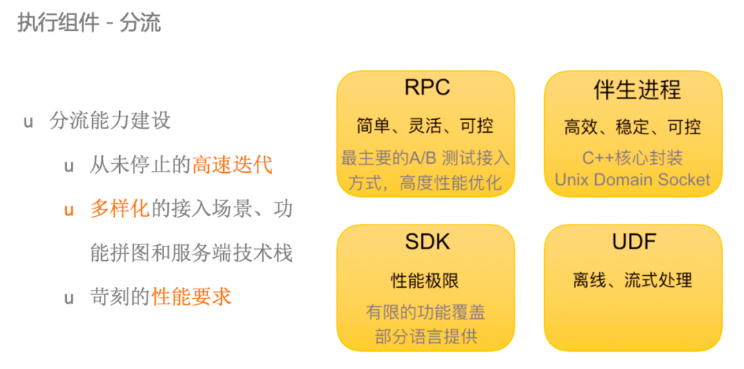 举例来说,在推荐系统的一个场景里面,如果需要在三万篇文章里进行召回实验,比如一次性召回五千篇文章。那么 RPC 肯定跑不动这个实验,全部的资源都会去进行 RPC 调用。但是如果用 SDK ,只需要一个 for 循环,就可以完成这个实验。那么,怎么可以结合 RPC 与 SDK 之间的优势呢?这里我们会讲到第三种方式——伴生进程。这种技术方案就是在业务进程的节点上,再添加一个伴生进程,用 C ++做封装,然后去做一个 Unix 的 Domain Socket。通过这种方式,网络传输只是在本地本机本节点上去做进程间的一个调用,可以使性能做到很大程度上的提升。同时,我们也可以保证对伴生进程的控制性,当有升级需求的时候,可以一定程度上对他们直接进行升级,而不会影响到业务方的迭代。最后一种是UDF分流。这是针对大数据的离线场景下,我们需要用实验去做一些分析和处理,所以会用到离线和流式处理。这边简单总结一下火山引擎会更愿意去用 RPC 进行分流的几个理由。- 第一是从未停止的高速迭代,我们要求对服务有比较强的控制,需要随时去更新它,去迭代它。