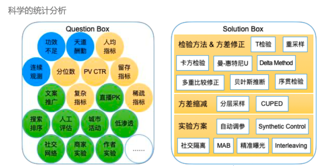 通过上述的自动化和第三方共建,可以在人力、有限的资源的条件下,保证我们的数据建设在高效的状态。第三部分我们聊一下科学的统计分析。“今天你显著了吗?”,显著对于一个实验来说还是蛮重要的指标。首先来说一下实验指标微涨时,到底是波动还是策略收益?我们需要通过假设检验来进行验证。图4-1的两个方框展示了对不同业务场景的假设检验方案。