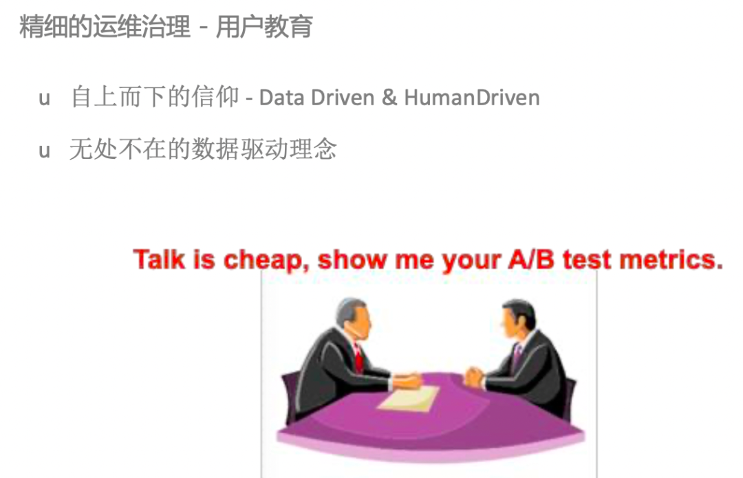 最后讲讲第四部分,精细的运维制度。对于实验平台,我们可能要“像对待孩子细心照料”。如果一个实验平台能够在一家公司里面很好地应用起来,必须自上而下让整个公司都拥有数据驱动的理念,如图5-1所示。