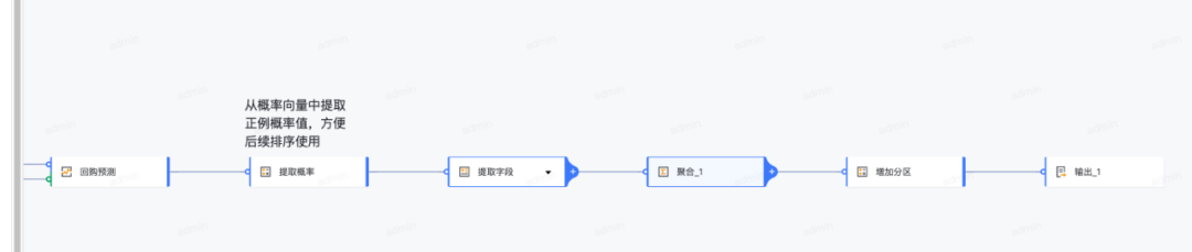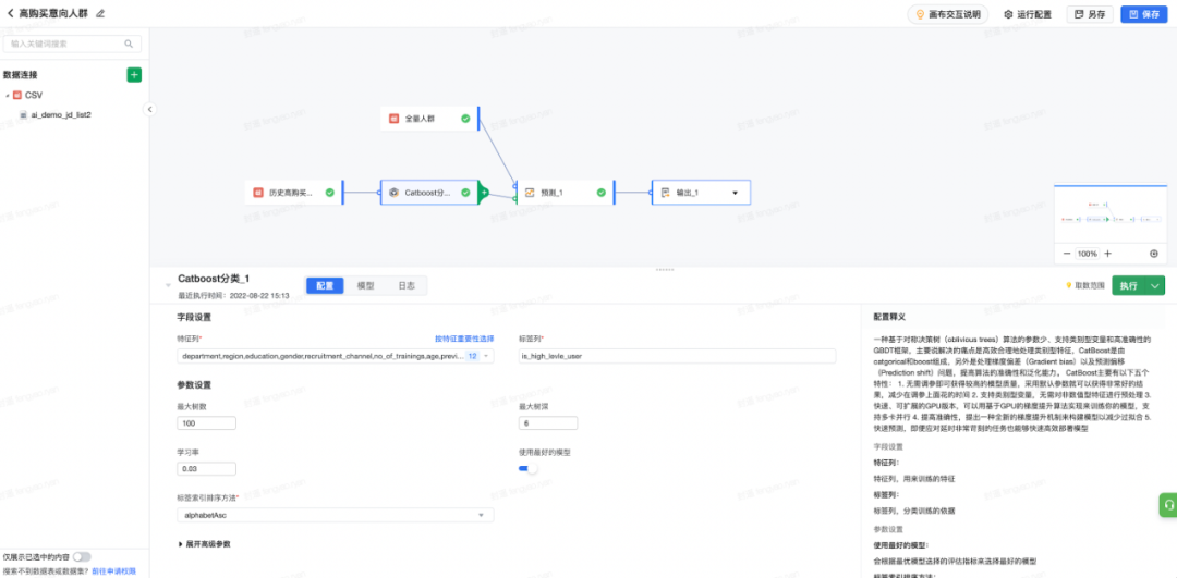 拖入样本数据和全部数据作为数据输入 拖入分类算法,如XGB算法用于模型训练 拖入预测算子,搭建模型与全部数据的关系进行预测 实际数据和预测结果结合输出数据集,从而分析全部用户数据的意向分布