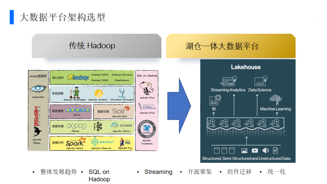 众所周知,大数据平台的架构选型一般有两种,一种是我们基于传统的 Hadoop 去构建大数据平台,另一种是根据新的湖仓一体的架构去构建大数据平台。但是在跟数仓、云数仓的竞争当中,发现前者相比于传统数仓在易用性上有很大的劣势。现如今,大数据平台的总体趋势已经开始从单一的 Hadoop 组件逐渐向多样化、生态化的湖仓一体的数据平台进行发展。