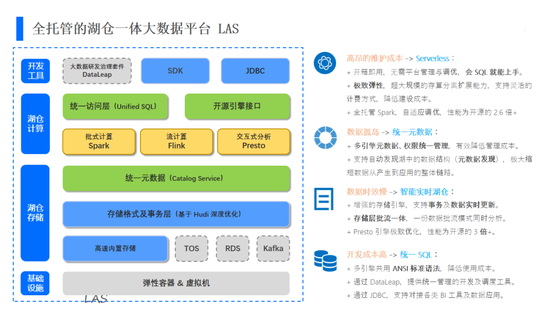 开发成本高 -> 统一 SQL:LAS 使用多引擎共用 ANSI 标准语法,从而降低使用成本。再进一步,通过 LAS 上层的另一个产品 DataLeap,提供统一管理的开发及调度工具。除此之外通过 JDBC,支持对接各类 BI 工具及数据应用。