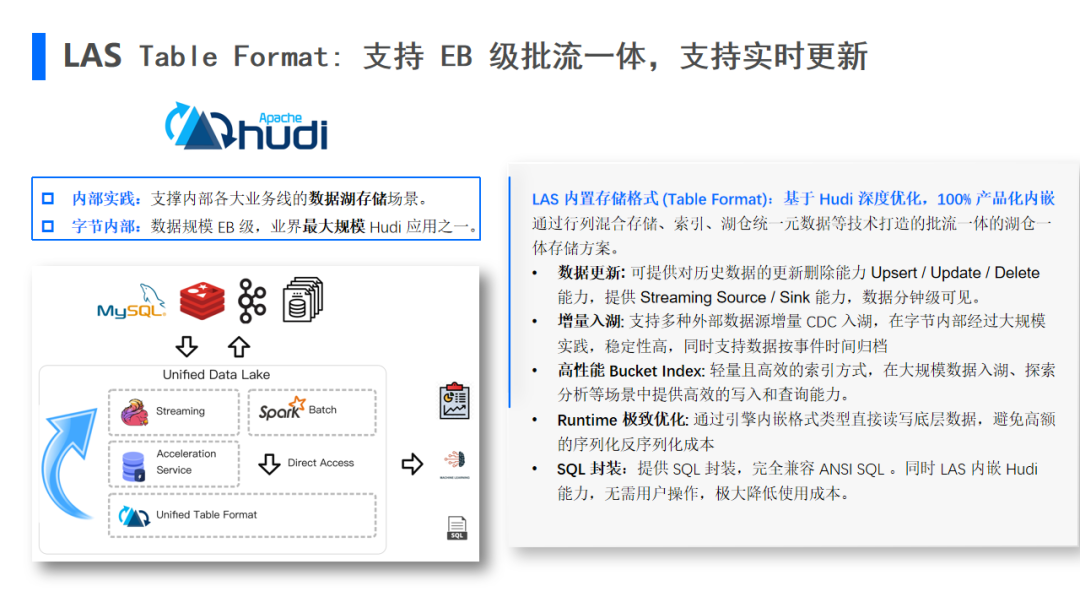 支持 EB 级批流一体,支持实时更新,基于 Hudi 深度优化,100% 产品化内嵌,通过行列混合存储、索引、湖仓统一元数据等技术打造的批流一体的湖仓一体存储方案。