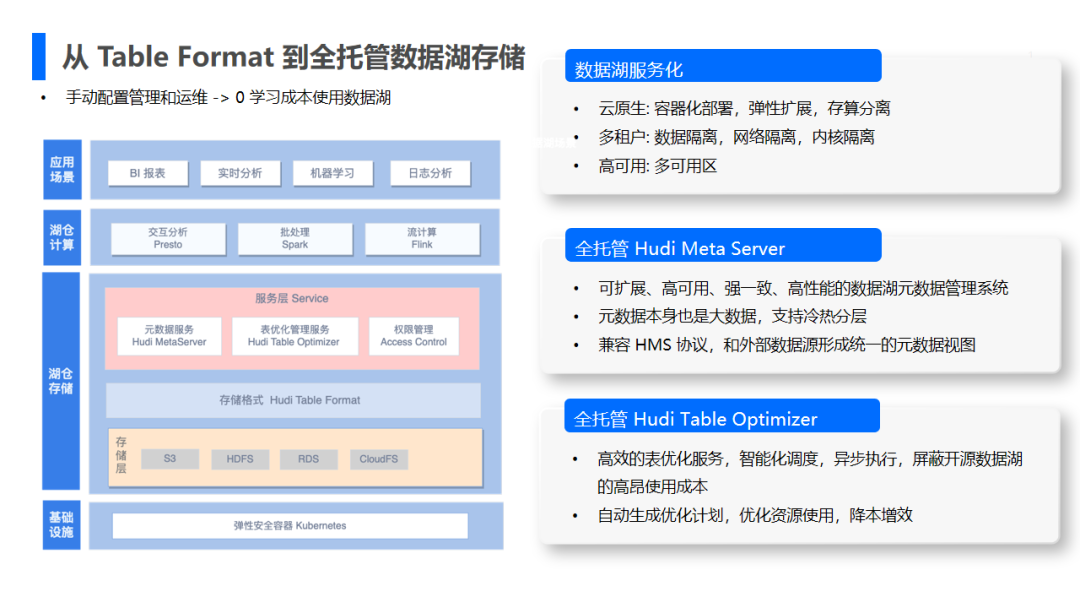 一个全托管的数据湖存储核心,就是要把数据湖整体服务化。设计目标是针对云原生多租户和高可用性去设计的。其次就是全托管 Hudi Meta Server,它是一个强一致的、高性能的一个数据湖元数据存储系统,最后是全托管的 Hudi Table Optimizer,这是一个专门针对 Hudi 表的一个优化服务。