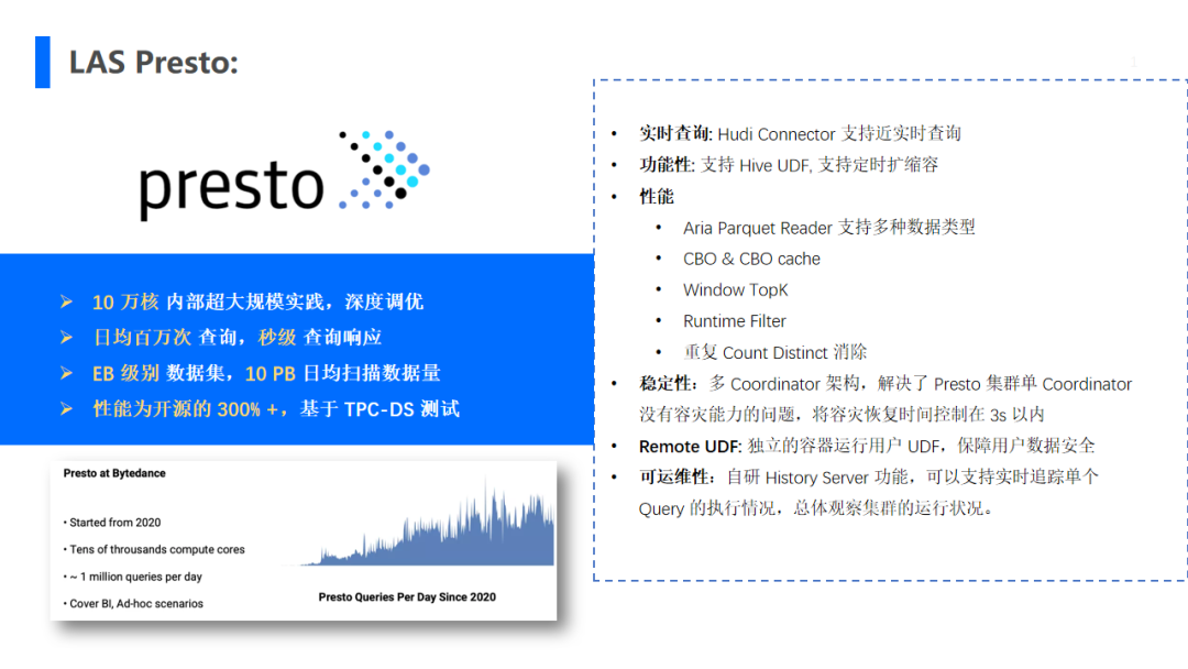 Presto 在字节内部有一个 10 万核的超大规模的实践,我们也依托于这个超大规模的实践,针对很多场景做了深度优化,LAS 的 Presto 有日均百万级的查询,提供一个秒级的响应能力。我们单个的数据集最大可能要接近 EB 级,每天扫描可能就要扫描实际 10 PB 的数据。我们的 Presto 的性能也基于 TPC-DS 测试,是开源版的3倍。