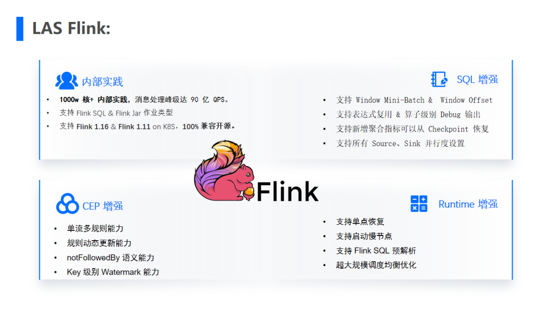 Flink 在字节内部有一个 1000W+ 核以上的内部实践,消息处理的峰值达到了 90 亿 QPS。这个 QPS 在 LAS 之上,也支持了 Flink SQL 和 Flink Jar 这两种作业类型。并且版本层面我们支持了一个开源最新的 1. 16 的版本,以及经过深度优化打磨过后的1. 11 的版本,基本上能做到百分之百的兼容开源。在其他层面我们也做了不少增强,比如 SQL 增加、CEP 增强以及 Runtime 增强。