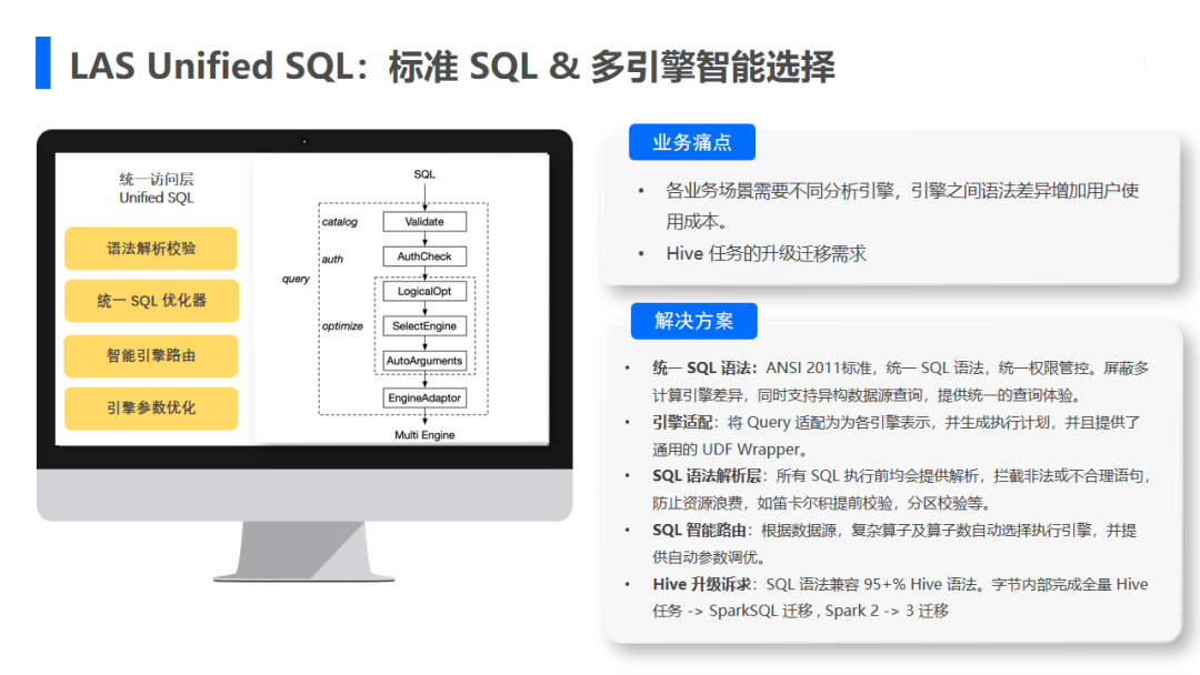 刚刚介绍了几个引擎,在引擎之上 LAS 提供一个增值的能力,用统一的一套标准 SQL,再加上多引擎的一个智能选择,去直接去用一种语法去使用这多个引擎,各业务场景它其实需要的引擎也不一样。