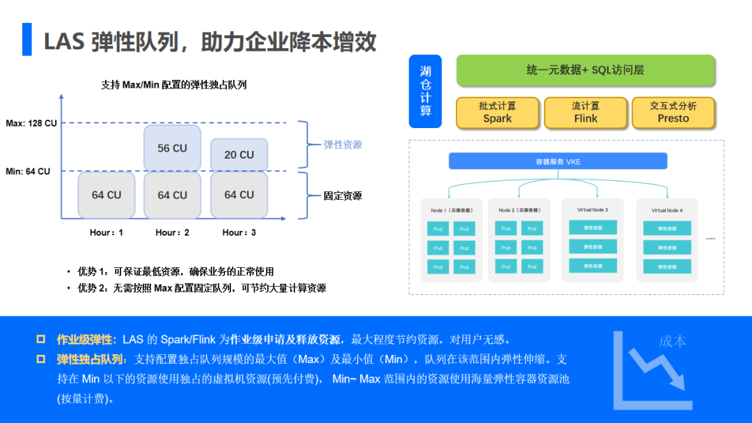 可以帮助助力到企业的降本增效。构建大数据平台,LAS 的 Spark/Flink 为作业级申请及释放资源,最大程度节约资源,响应客户的需求。