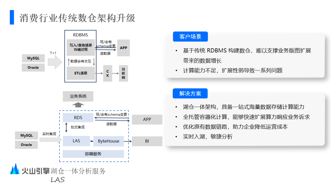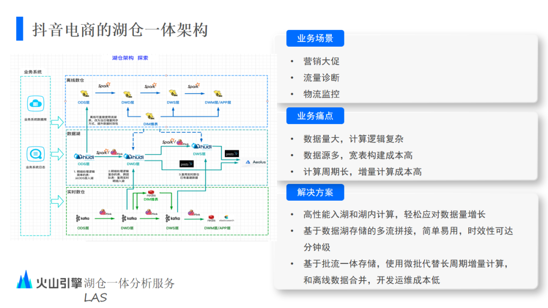 数据时效慢 -> 智能实时湖仓:LAS 提供一个全托管的智能浮仓,底下有基于 Hudi 深度去优化的一个批流一体存储引擎,支持事务及数据实时更新。同时实现了让一份数据在多种多个引擎、多种查询模式下去进行同时分析, 在这种场景下,Presto 的引擎也做了极致的优化,性能是在开源的 3 倍以上。