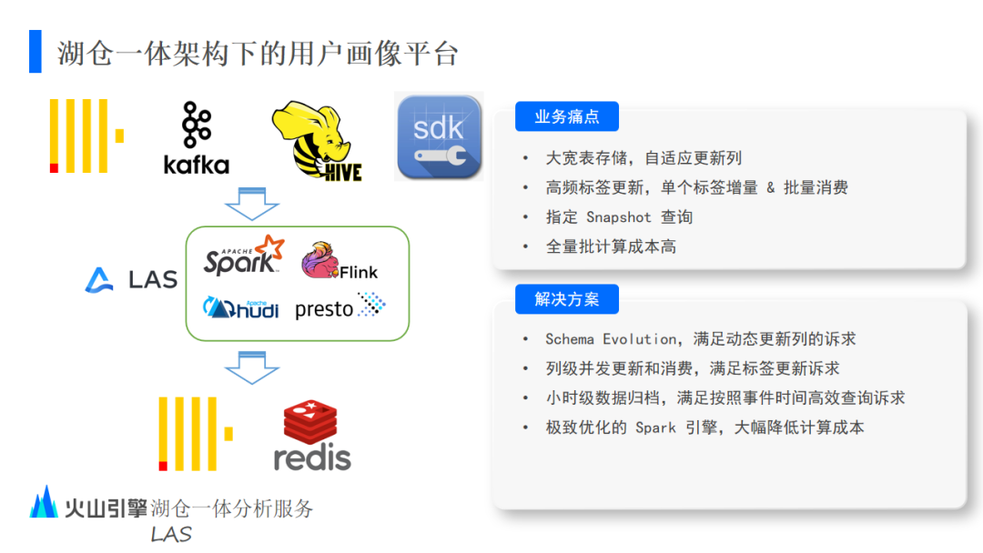 用户画像的平台也是有一个特别大的特点,就是数据源是比较多的。业务痛点主要是大宽表存储,自适应更新列难;高频标签更新,单个标签增量 & 批量消费,指定 Snapshot 查询,全量批计算成本高。我们这边的解决方案是基于 Schema Evolution,满足动态更新列的诉求;列级并发更新和消费,满足标签更新诉求;小时级数据归档,满足按照事件时间高效查询诉求;极致优化的 Spark 引擎,从而大幅降低计算成本。