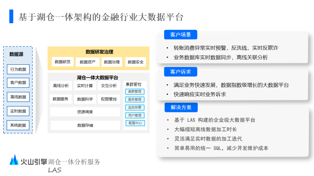 客户对我们的诉求,是我们要给他提供一个满足业务快速发展,并且能支撑数据指数据增长的一个大数据平台。另外一个重点就是我们能快速的去响应实时业务诉求。LAS 它本身去具备了一个企业级大数据平台的能力,它的能力其实覆盖了离线计算、实时计算、交互式分析、用户场景。我们基于 LAS 构建的企业级大数据平台,大幅缩短离线数据加工时长,同时灵活满足实时数据的加工迭代,简单易用的统一 SQL,从而减少开发维护成本。