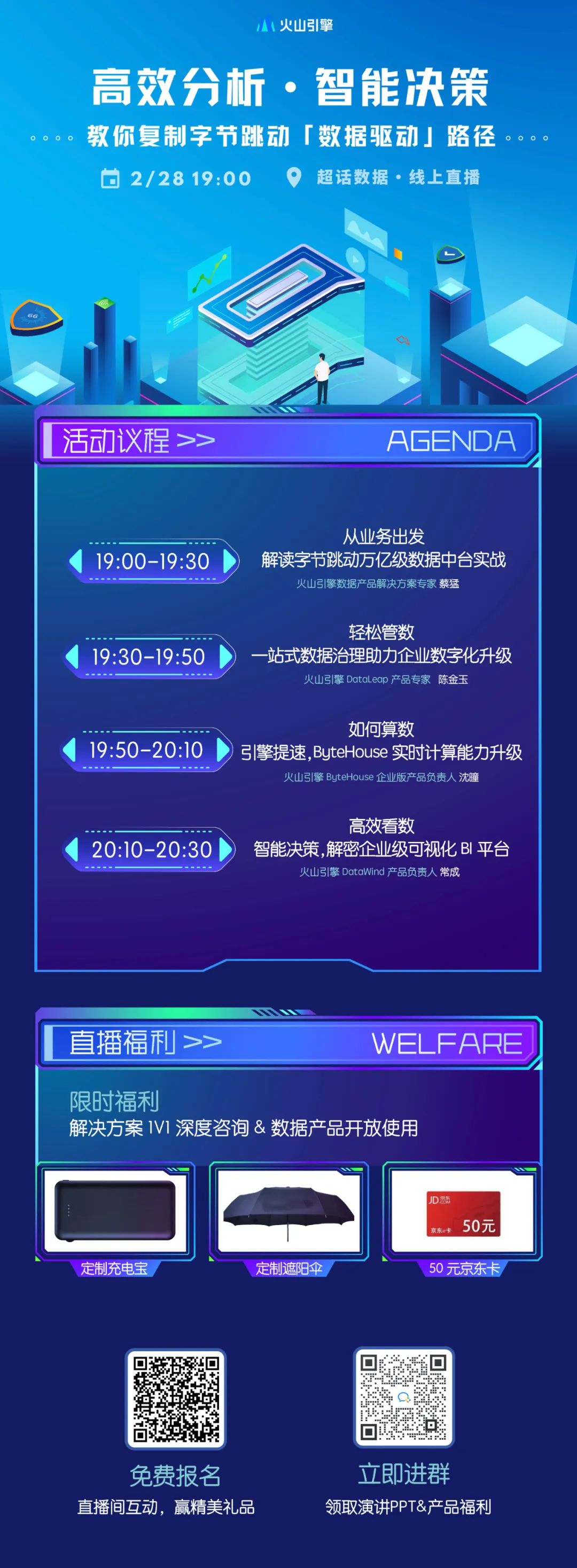 结合最被企业关心、也是最难决策的企业数字化转型这一话题,来自火山引擎数智平台的 4位专家,围绕数字化转型离不开的技术选型、中台建设、数据驱动等主题,从来源于“字节跳动内部万亿级数据中台实战”展开,再为你详细解答企业如何“管数”、如何“算数”、如何“用数”三大难题,从「中台架构宏观设计」到「数据应用落地」,带你思考企业数字化转型的方方面面,并复制字节跳动「数据驱动」路径!