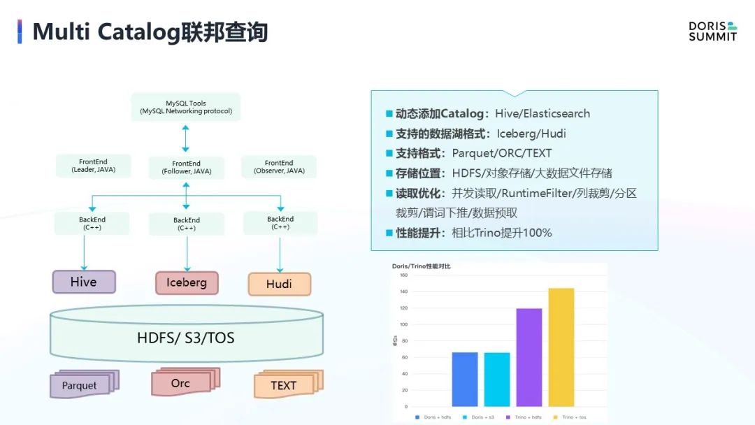 于是通过 Catalog 直接查询 Hive、Iceberg、Hudi 表。经过了两个月的开发,目前已经支持三大数据组织模式,也支持数据存放在 HDFS、S3 和 TOS 上,数据格式也支持最常见的 Parquet、ORC、TEXT等。